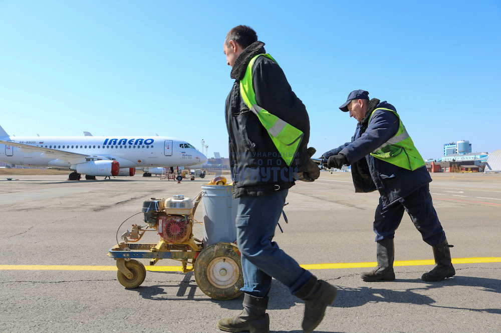Несколько слов о технике и материалах. Все работы по нанесению разметки на аэродроме Иркутска производят при помощи специального оборудования – аппарата для нанесения разметки GRACO LINELAZER 5900; эта техника легка в управлении, маневрена, при движении хорошо сохраняет равновесие и позволяет наносить ровные чёткие линии. Для разметки используют сертифицированную быстросохнущую эмаль. В год в аэропорту Иркутска расходуют от 5 до 6 тонн белой краски, около 4 тонн жёлтой и тонну красной. Есть и чёрная краска, её используют при проведении корректирующих работ.
