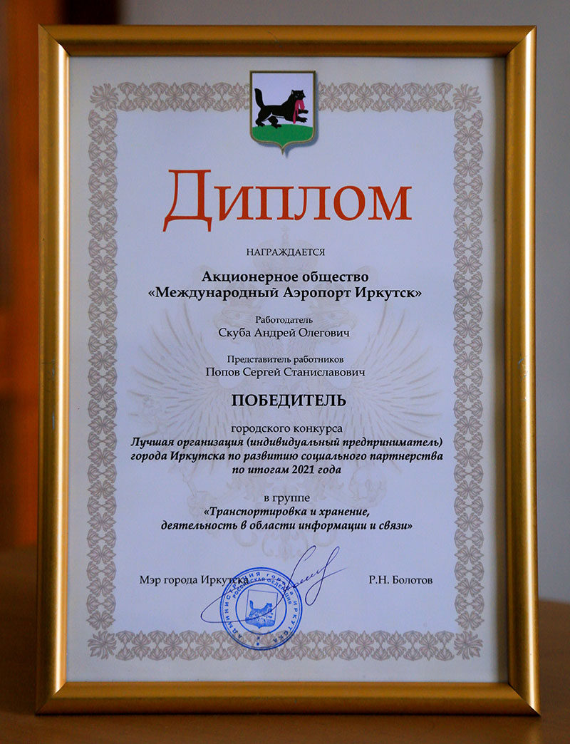 «Международный аэропорт Иркутск» занял место победителя в городском конкурсе «Лучшая организация города по развитию социального партнерства» в группе «Транспортировка и хранение, деятельность в области информации и связи».