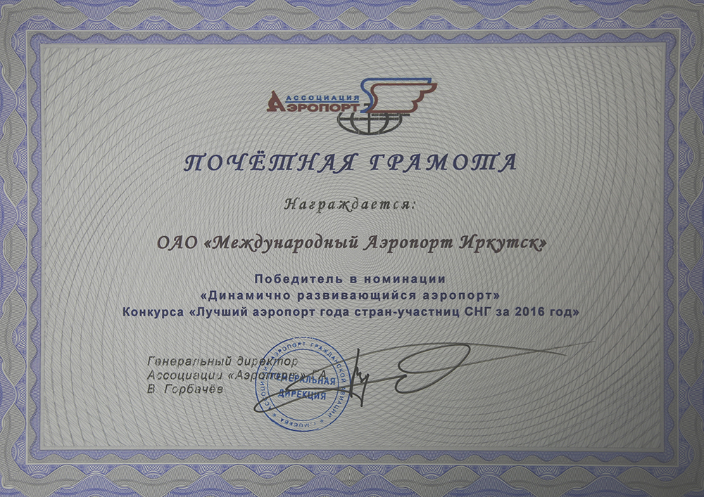 Международный аэропорт Иркутска стал победителем конкурса «Лучший аэропорт года стран СНГ» в номинации «Динамично развивающийся аэропорт» среди предприятий с объемом перевозок от одного до двух миллионов пассажиров.