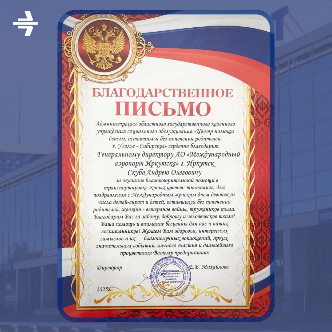 «Международный аэропорт Иркутск» оказал благотворительную помощь двум социальным учреждениям Иркутской области, освободив от уплаты терминальных сборов поставку партии тюльпанов и мимоз, предназначенных для проведения праздничных мероприятий, приуроченных к Международному женскому дню 8 марта.
